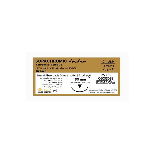نخ جراحی کرومیک سوپا نخ استریل قابل جذب است که اعمالی برای افزایش مدت مقاومت آن در برابر روند هضم یا افزودن املاح کروم انجام شده است. نخ کرمیک که با کرمه کردن نخ پلین بدست می آید، به دلیل ماهیت پروتئینی که دارد، با نسوج بدن سازگار است. این نخ به رنگ قهوه ای است و با سایزهای مختلف، متصل به سوزن (فولادی ضد زنگ) در انواع و اندازه های مختلف وجود دارد. نخی که مشاهده می کنید، نخ کرمیک به قطر 3/0، به طول 75 سانتی متر و با سوزن37 میلی متری و سطح مقطع ریورس کات به شکل 3/8 دایره ای می باشد. در رابطه با قطر نخ، هرچه قطر نخ بیشتر باشد مدت زمان جذب نخ نیز افزایش می یابد.